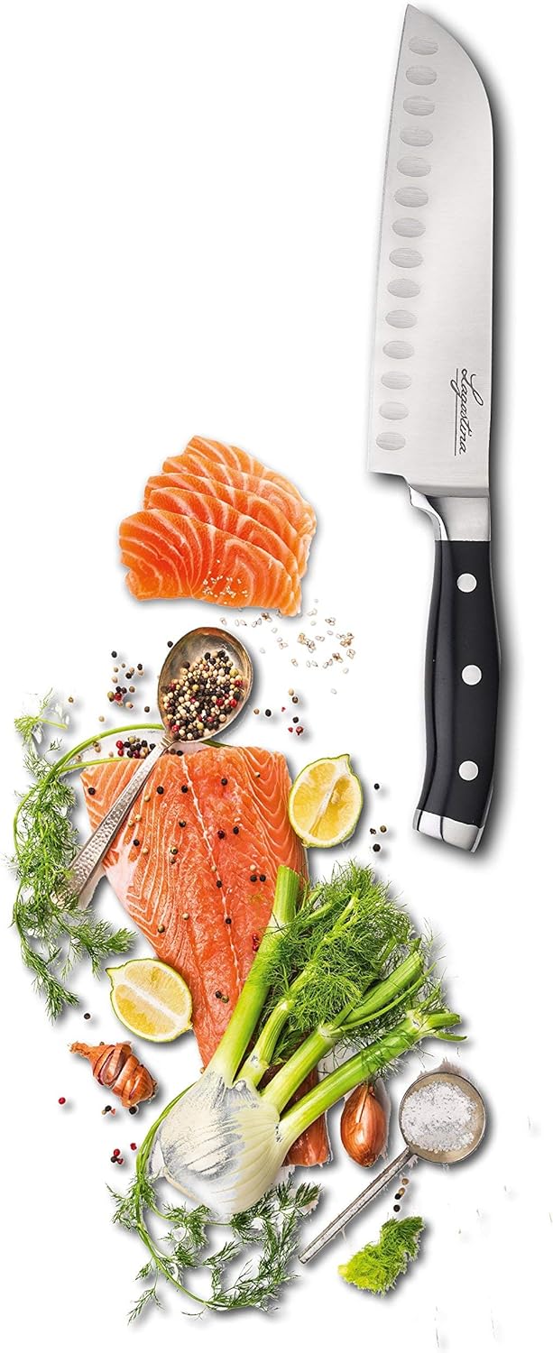 - Ein Santokumesser 18 cm aus Edelstahl Robustes, verbindet Leistung, Langlebigkeit und Sicherheit.