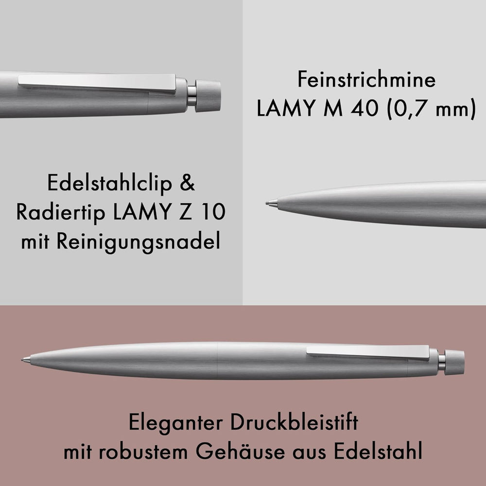 - Lieferumfang: 1 x LAMY 2000 Druckbleistift 102 aus Edelstahl in der Silber mit Feinstrichmine (LAMY M 40) und Geschenketui