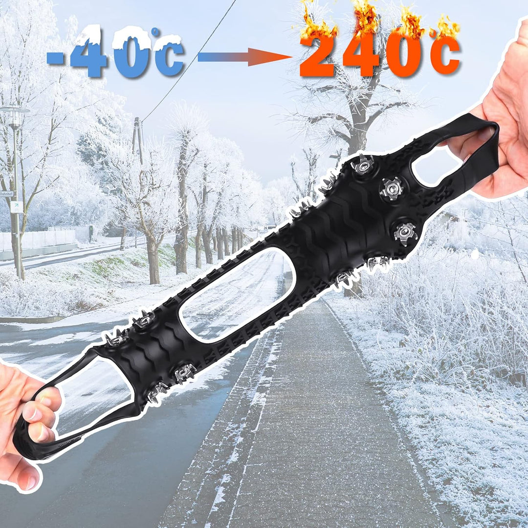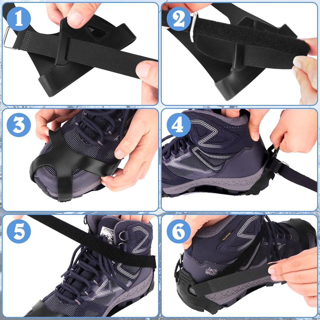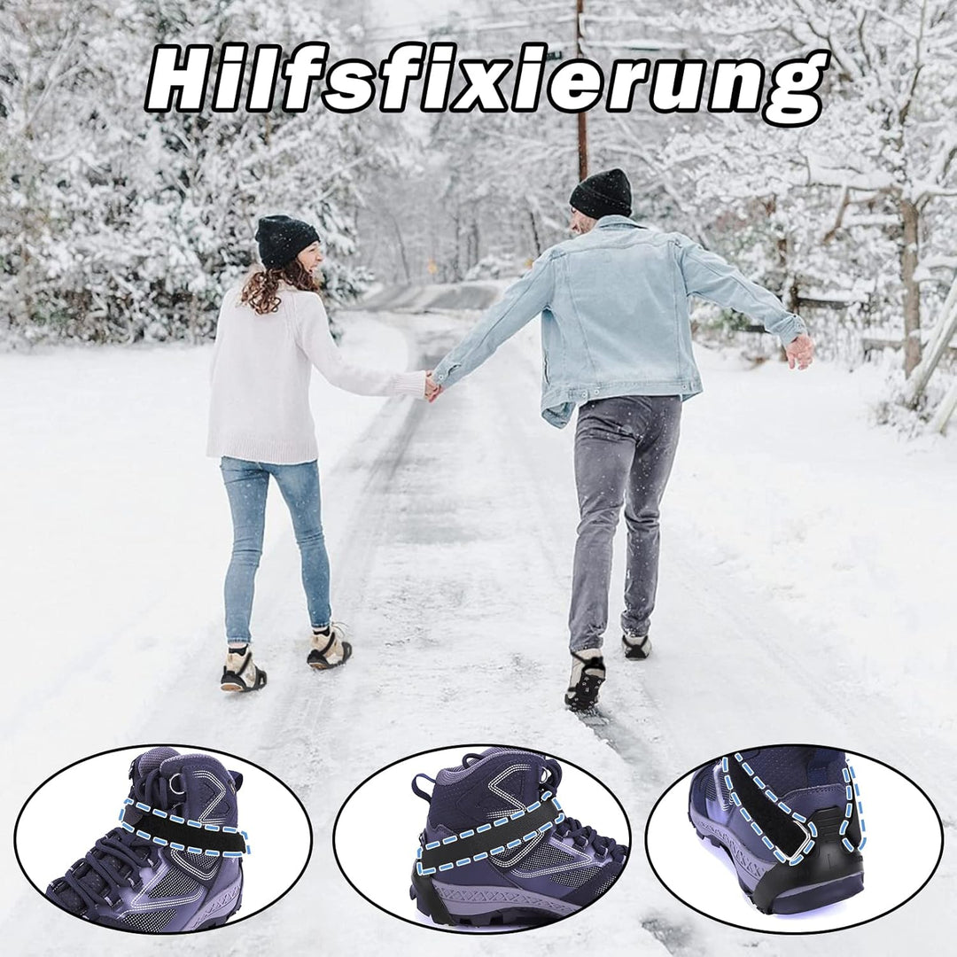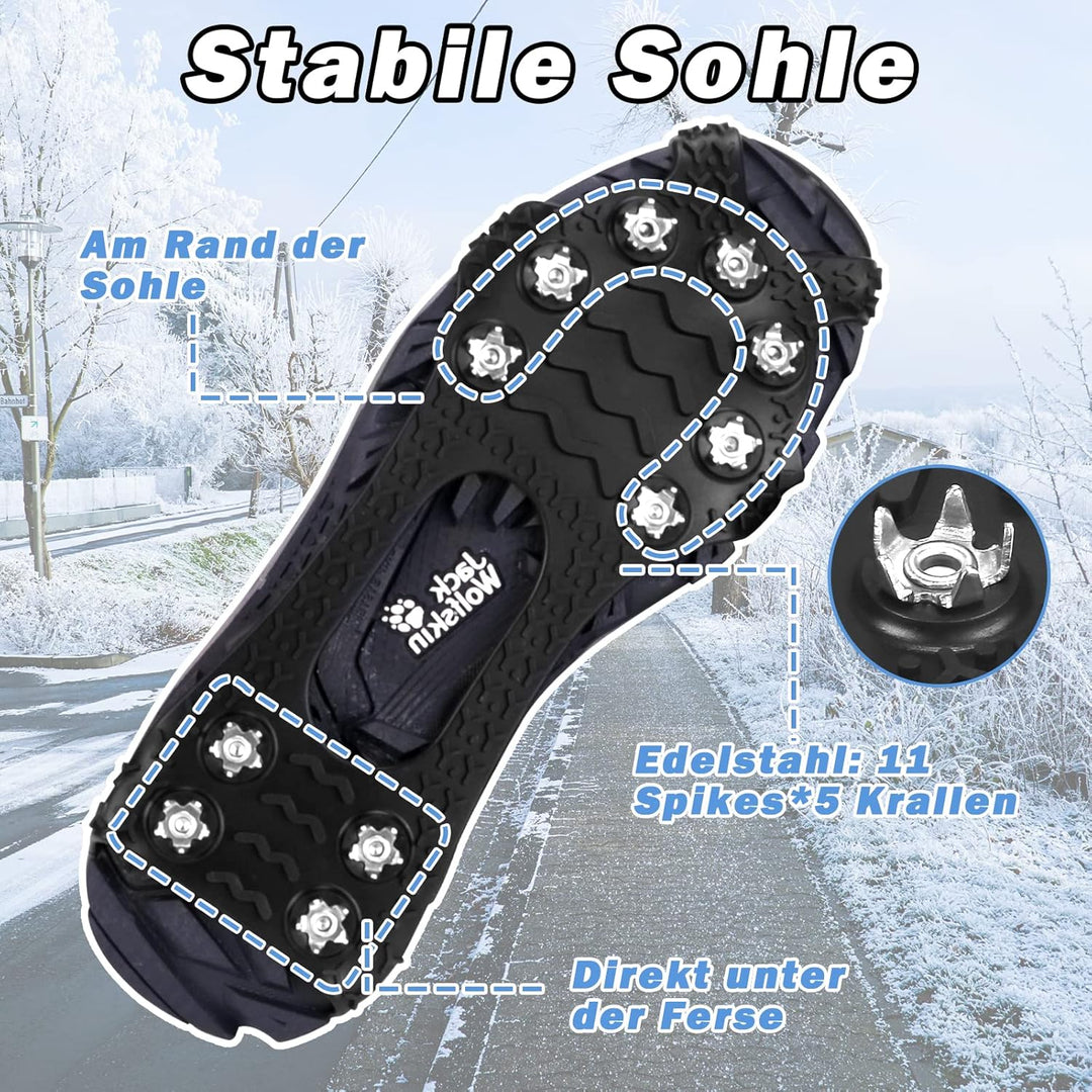 - ❄️Edelstahlspikes❄️ 11 Edelstahlspikes, die gleichmässig am Sohlenrand verteilt sind, ermöglichen dem Träger ein gutes Gleichgewicht im Schnee. Die Schuhspikes verzichten auf die traditionelle Single-Spike-Struktur. Jeder Spike hat 5 Zähne