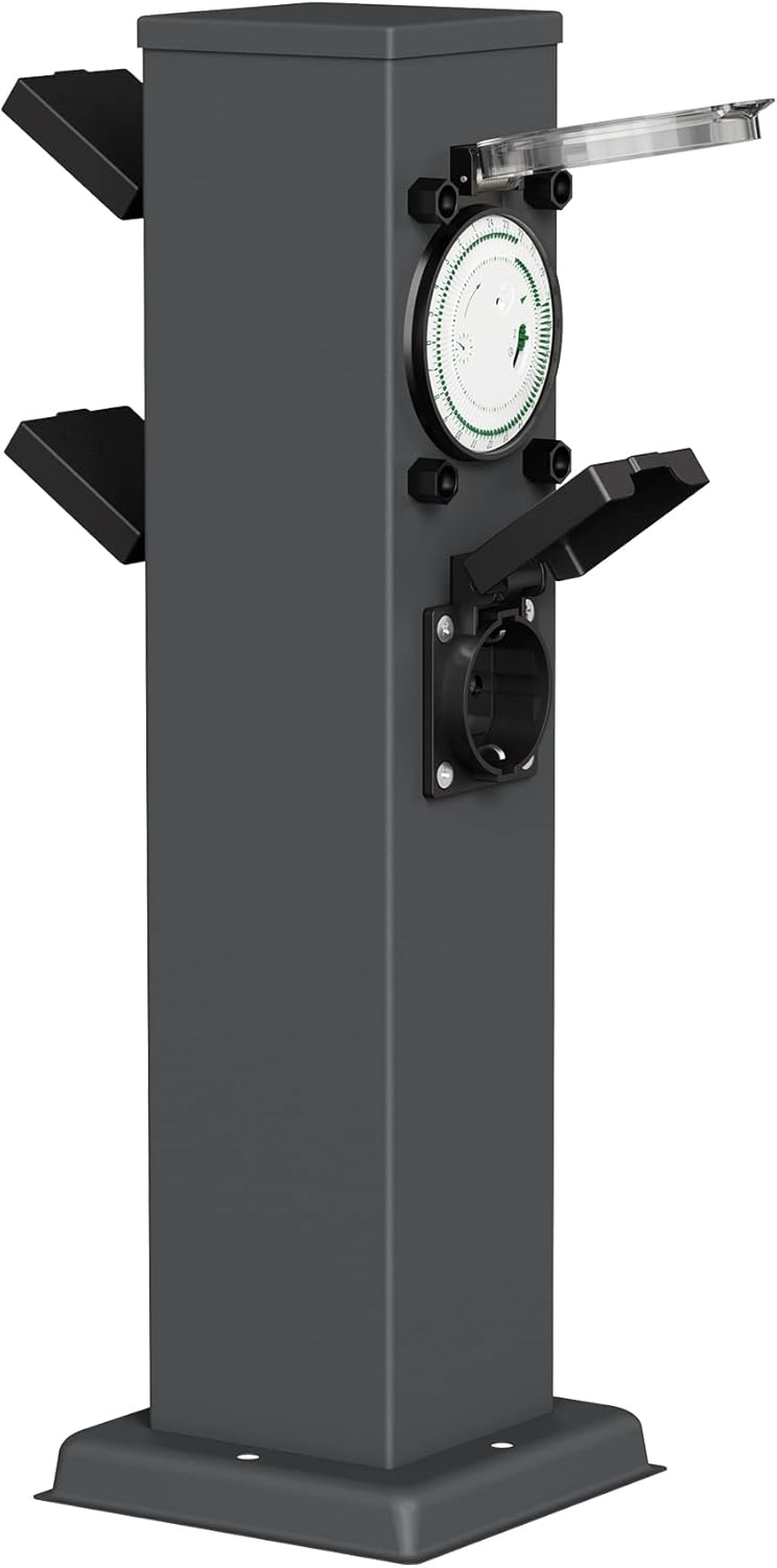 • [Integrierte Zeitschaltuhr] - Die Gartensteckdosensäule POLLY kann sowohl manuell als auch automatisch über die integrierte Zeitschaltuhr gesteuert werden. Die Zeitschaltuhr ist mit allen 3 Steckdosen verbunden und ermöglicht eine komfortable An- und