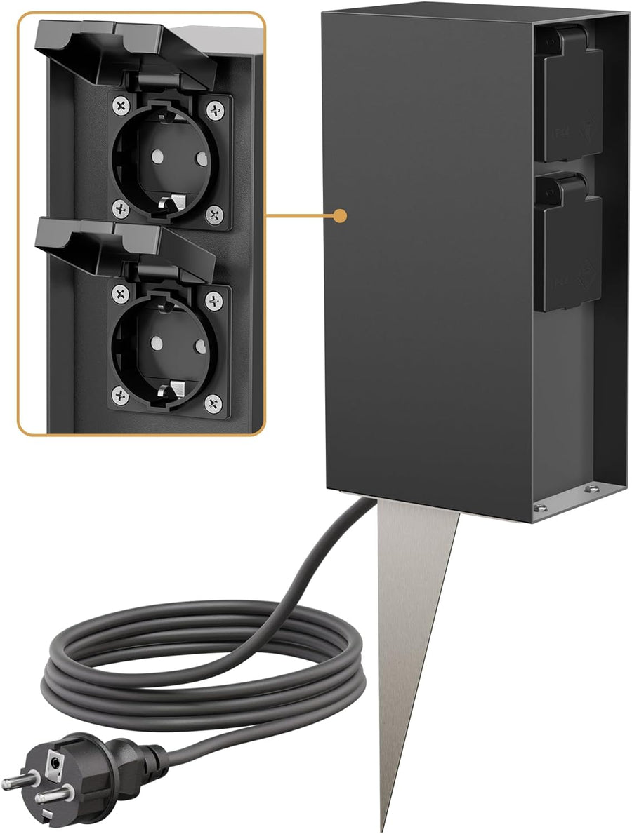- [Kompakte, eckige Bauform] - Dank ihrer kompakten Abmessungen (85 x 230 x 120 mm) lässt sich die Steckdosen-Säule problemlos auf dem Rasen oder der Terrasse aufstellen. Mit ihrem minimalischen Design fügt sie sich stilvoll in jede Umgebung ein.