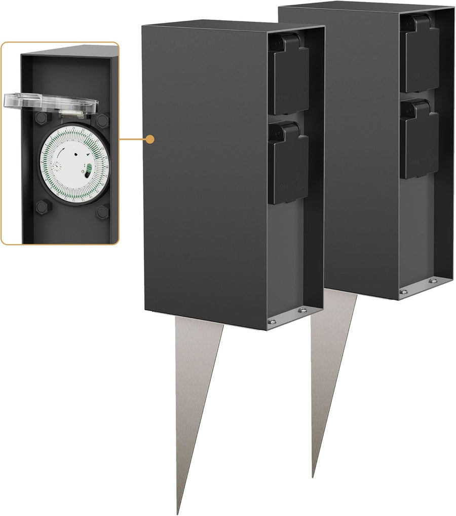ledscom.de 2X Garten-Steckdosensäule POMI mit Erdspiess für aussen, IP44, Timer/Zeitschaltuhr, 2-Fac