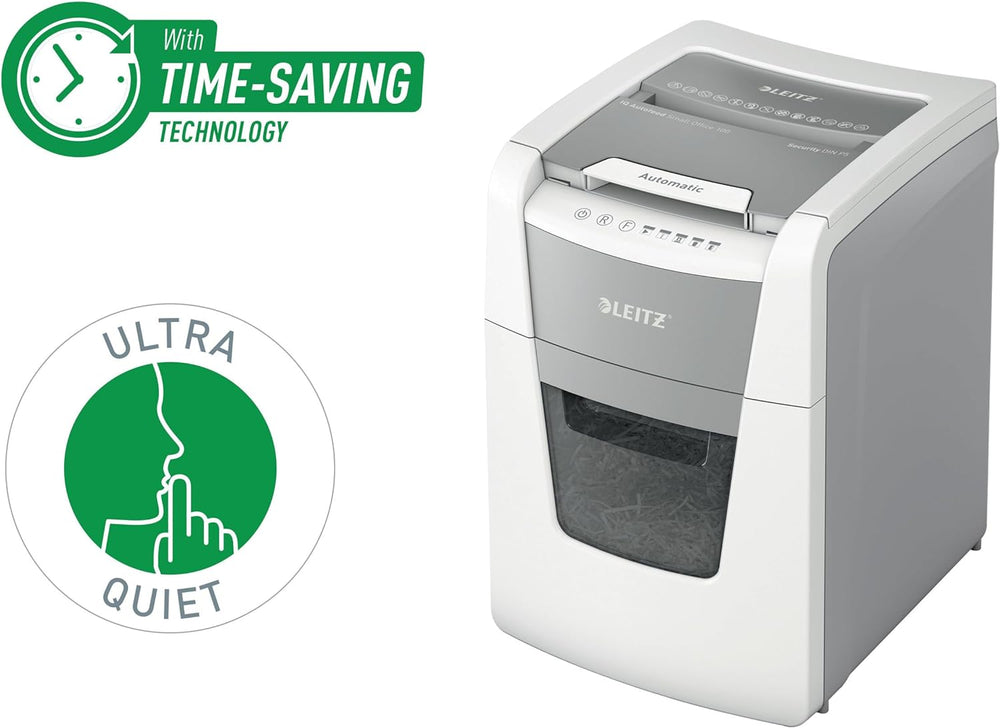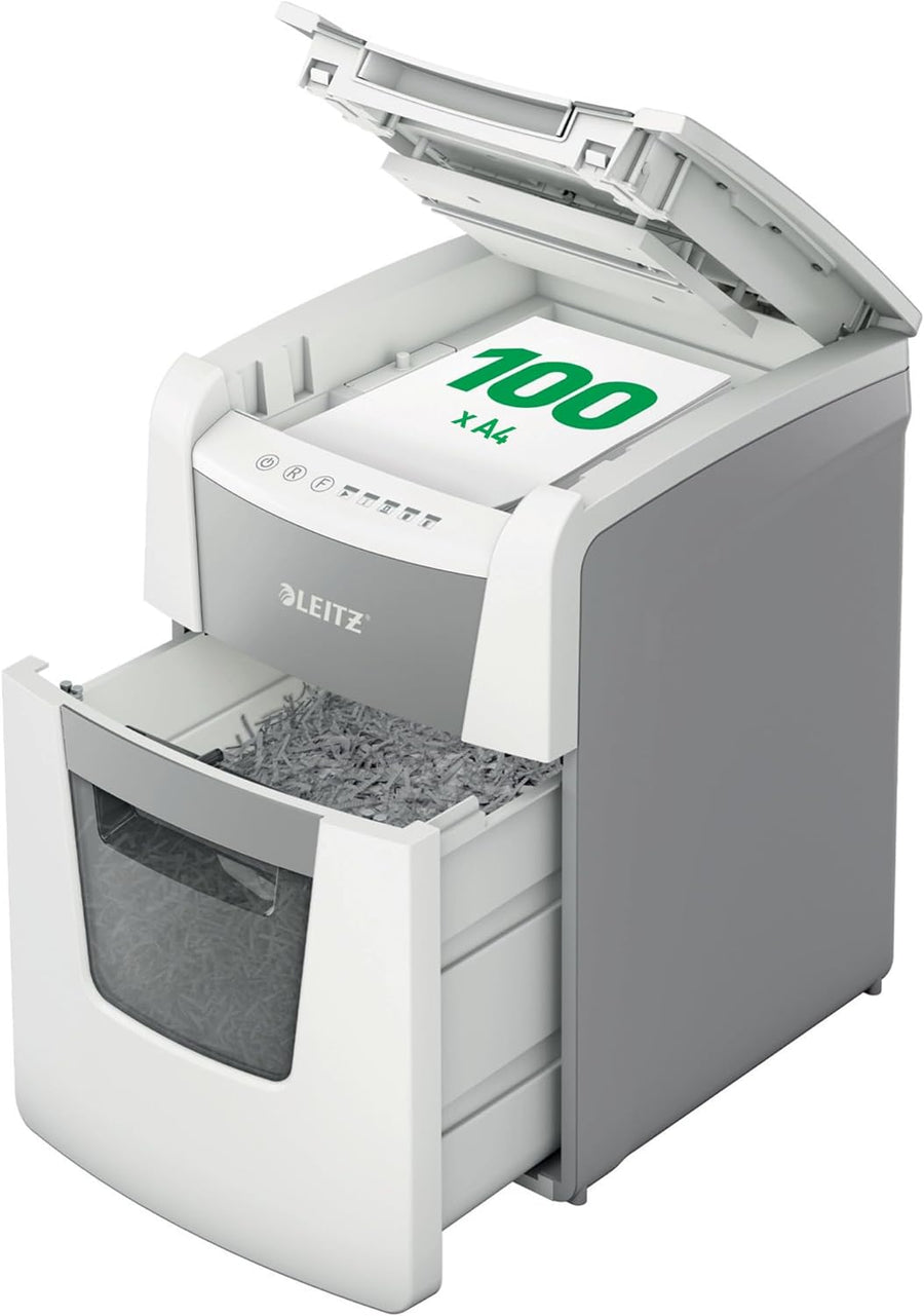 - Lieferumfang: 1 x Leitz IQ Autofeed Mikroschnitt Aktenvernichter, 100 Blatt, Abmessungen (B x H x T) 365 x 530 x 430 mm, 80120000
