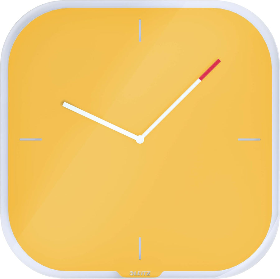 - Lieferumfang: 1 x Leitz Wanduhr mit Glasoberfläche, Inkl. 1 x Stift, Masse (BxHxT): 300 x 40 x 300mm, Farbe: Warmes Gelb, Cosy-Sortiment, Kartonverpackung, 90170019