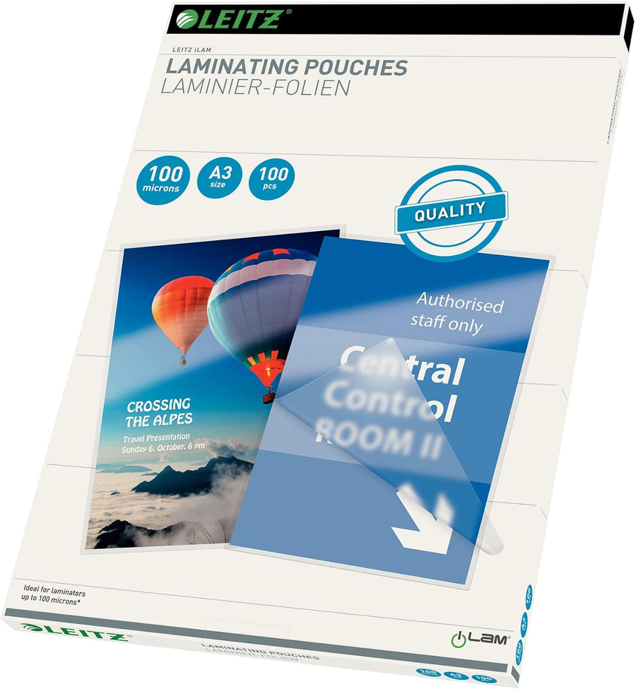 • Lieferumfang: 1 x 100er Pack Leitz Laminierfolien A3 100 mic, 16919, für DIN A3 (30,3 x 42,6 cm), Abmessungen BxHxT: 30,9 x 2,4 x 43,0 cm