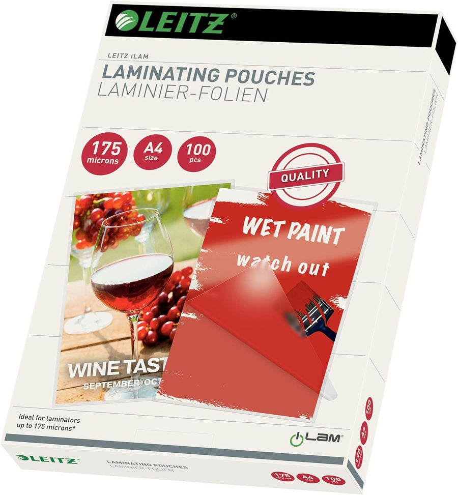 - Lieferumfang: 1 x 100er Pack Leitz Laminierfolien A4 175 mic, 16933, für DIN A4 (21,6 x 30,3 cm), Abmessungen Pack BxHxT: 22,2 x 4,0 x 30,9 cm