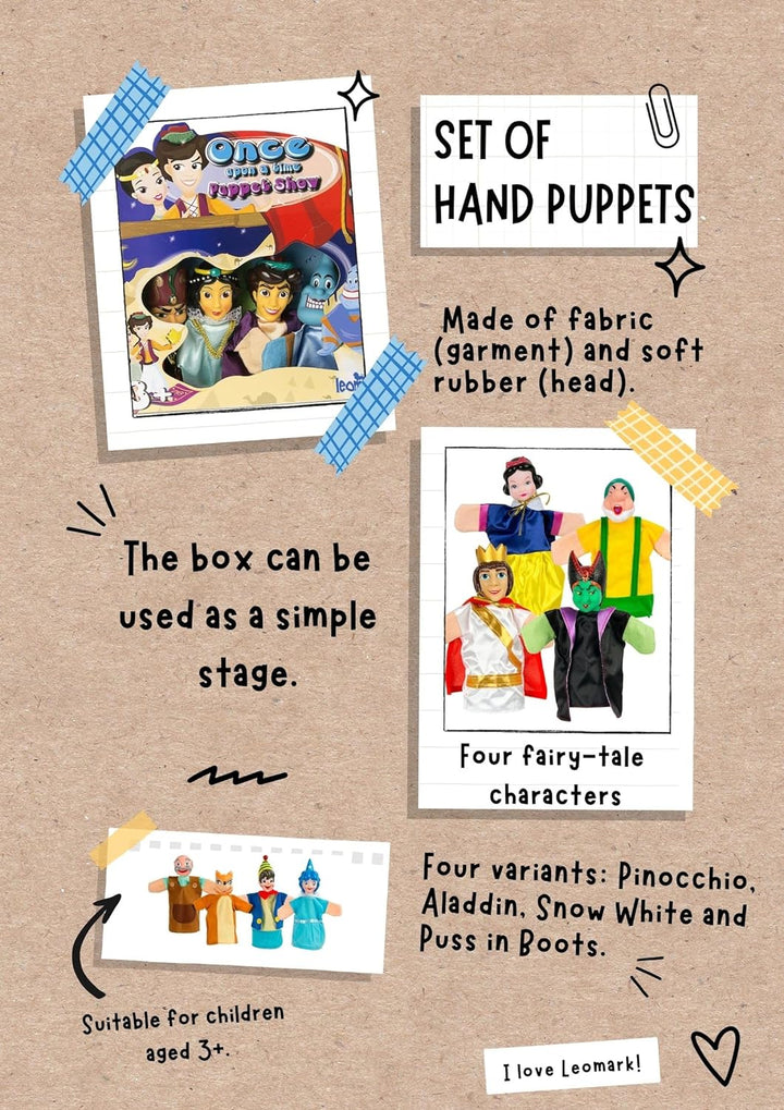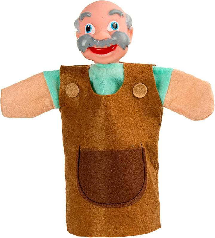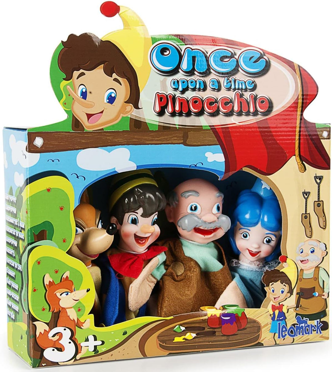 - 💚 Ein Set aus vier bunten Handpuppen: Pinokio, Dzepetto, Fee, Fuchs.