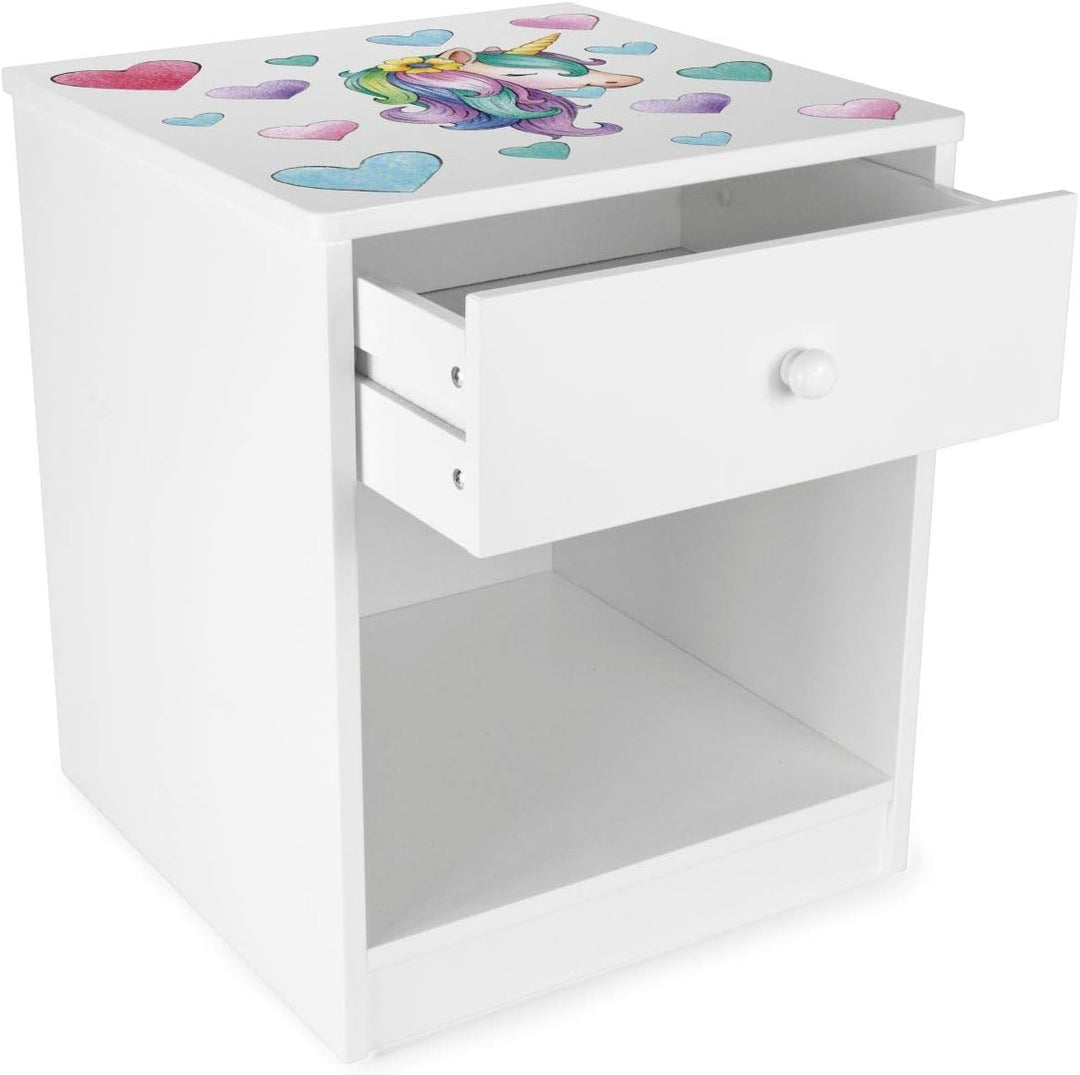 Leomark Nachttisch aus Holz - Einhorn - Nachtschränkchen mit Schublade, Nachtschrank für Kinder, Wei