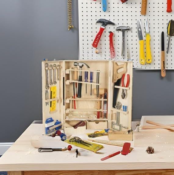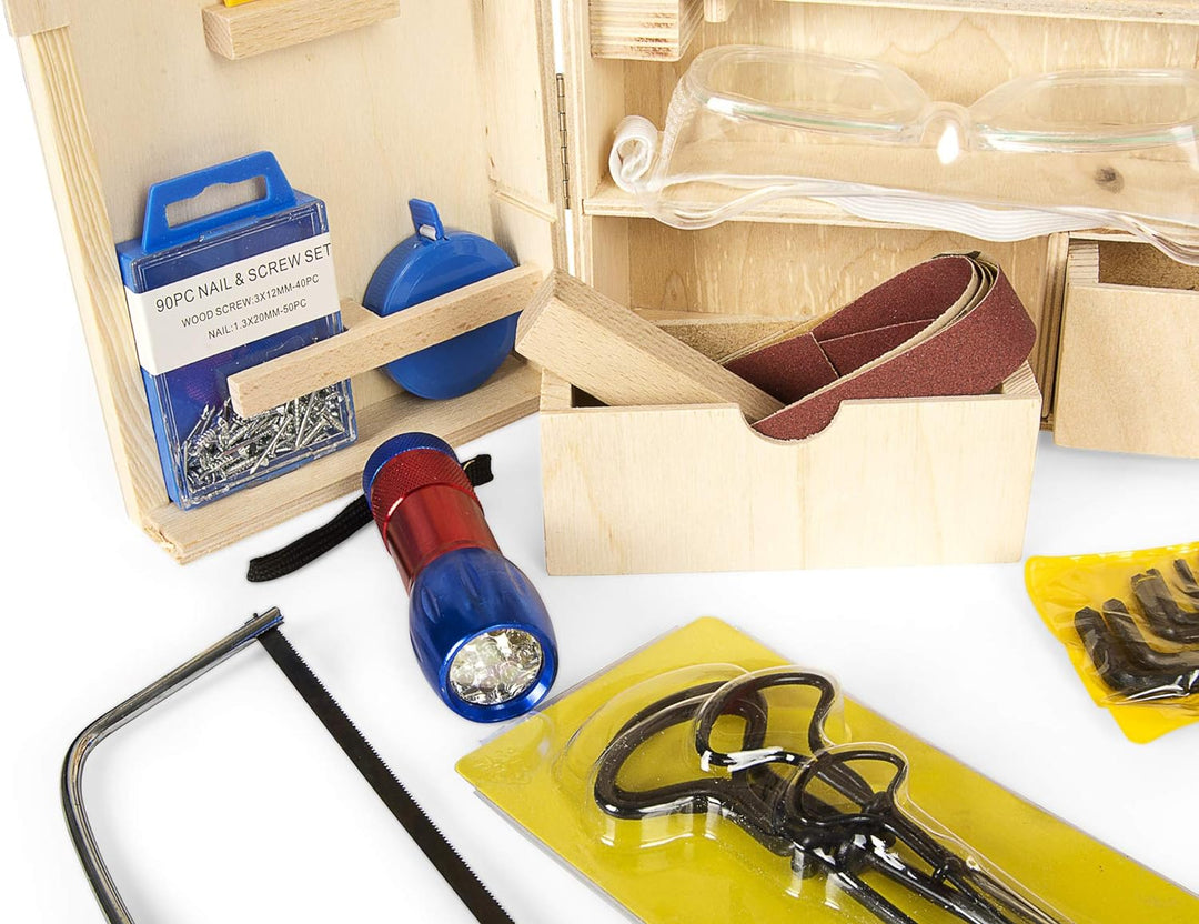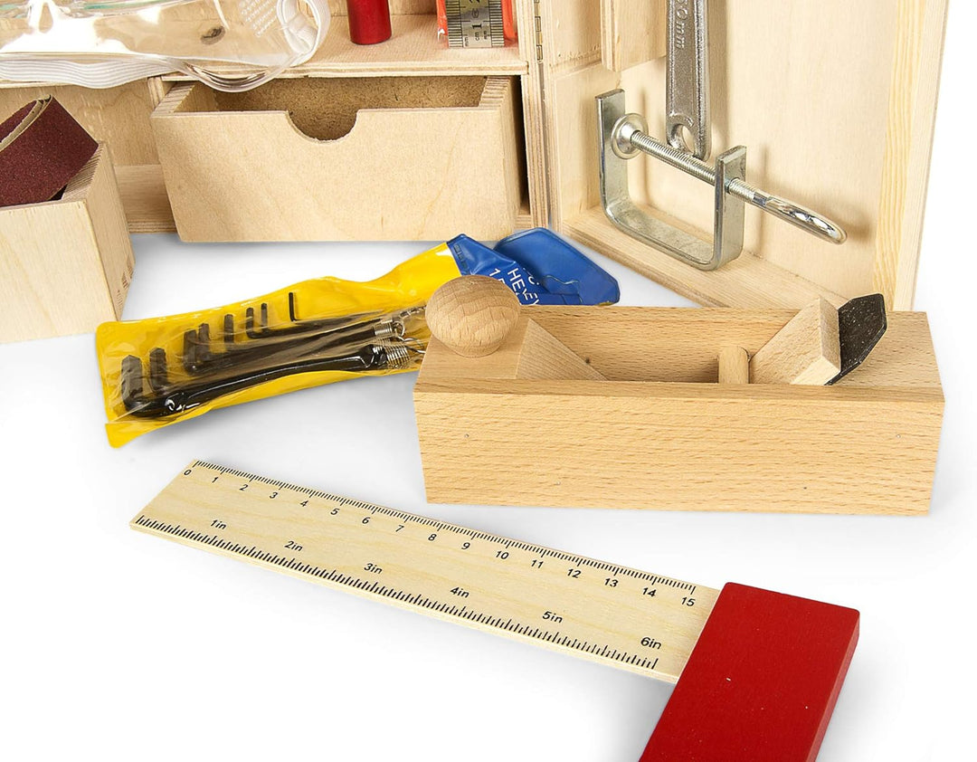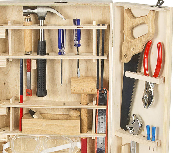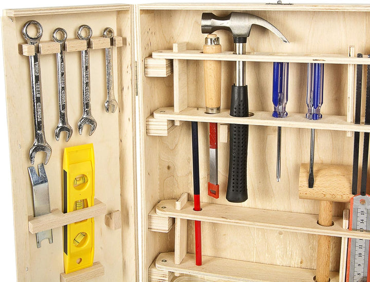 - 🟤 [HOHE QUALITÄT] Grosse Werkzeugkasten Leomark für junge Schreiner und Mechaniker. Grosse Kiste aus Holz voller Werkzeuge und notwendigen Zubehör. Die Kiste besitzt Schloss, um versehentliches Öffnen zu schützen.