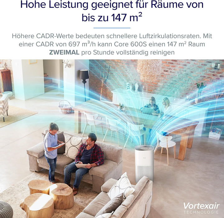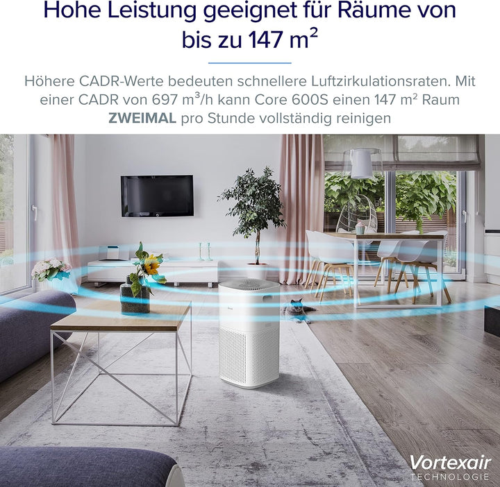 - 【Hohe Leistung für grosse Räume】Mit CADR von 697m³/h und der 360-Grad-Lufteinlasskonstruktion reinigt Core 600S ein grosse Räume bis zu 147㎡ zweimal pro Stunde. Dank seines energieeffizienten Designs erreicht der Luftreiniger eine maximale