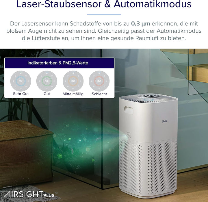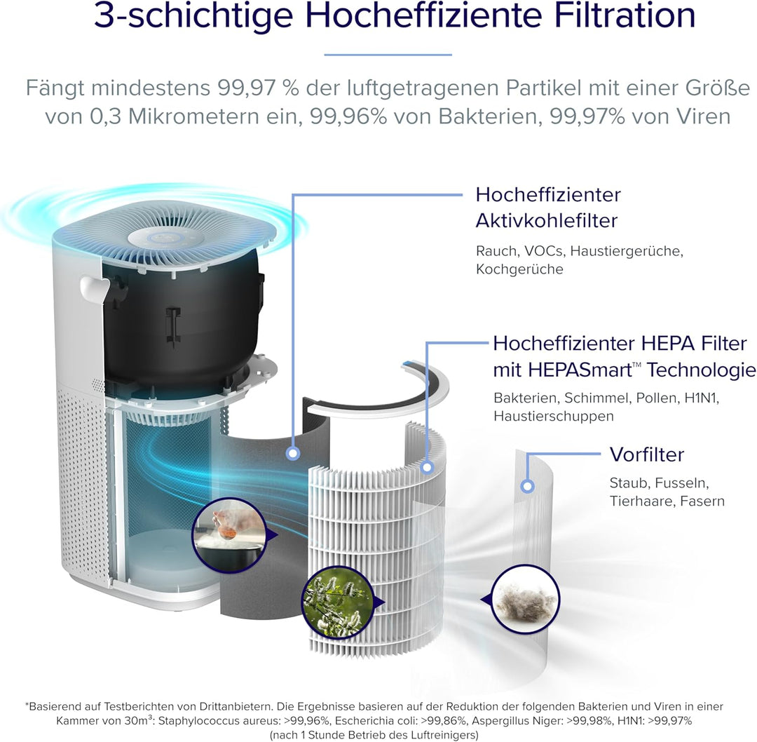 - 【Hocheffizienter HEPA Luftfilter】Die 3-schichtige Filterung mit HEPA-, Aktivkohlefilter und Vorfilter entfernt 99,97 % der ultrafeinen Partikel mit einer Grösse von 0,3µm, damit Sie vor Schimmel, Staub, Pollen, Tierhaaren, Gerüche,