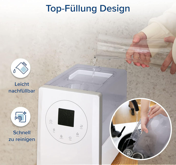 - 【TOP-FILL FÜR REINIGEN & EINFÜLLEN 】Mit dem Top Fill Design und abnehmbaren Wassertank können Sie das Wasser direkt von oben einfüllen. Dies ist praktisch und vermeidet unnötige Wasserlecks. "Kein Leck, leichte Zerlegung und einfache Reinigung" sind die herausragenden Vorteile des Luftbefeuchters LV600S gegenüber denen mit Bodenbefüllung