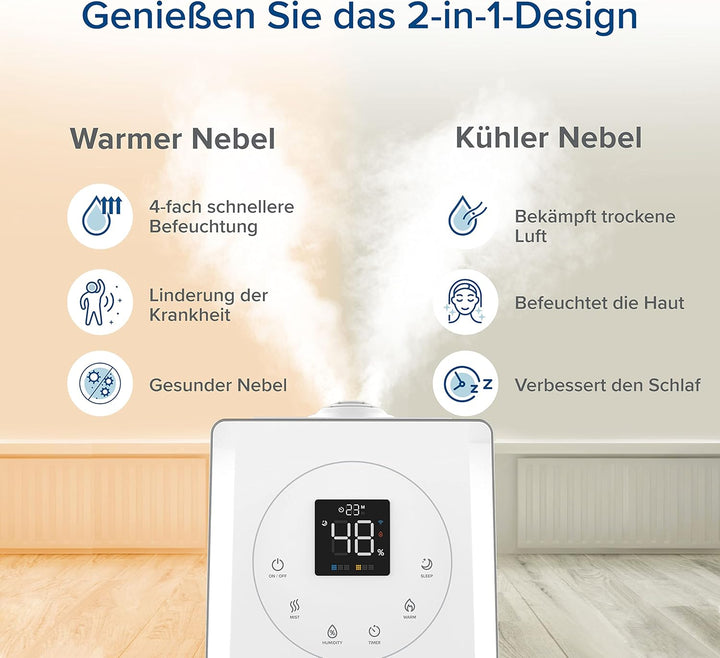 - 【WARMER & KALTER NEBEL FÜR GESUNDHEIT】Im Gegensatz zu herkömmlichen Luftbefeuchtern können Sie beim LV600S zwischen 2 Nebeleinstellungen wählen, die sich positiv auf Ihre Gesundheit auswirken. Der warme Nebel befeuchtet den Raum 4X schneller und fühlt sich im Winter wohler an, während der kühle Nebel Ihre Trockenheit,Symptome und Allergien im Sommer mit Feuchtigkeit versorgt