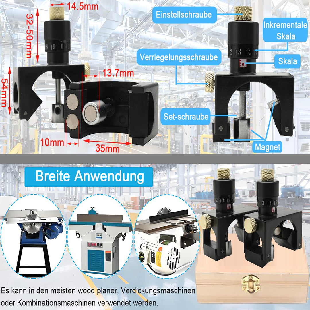 - Effizient Tool: Die Vorrichtung verwendet starke Magnete, um Hobel- oder Abrichtmesser in perfekter Position zu halten, sodass Sie beide Hände frei haben, während Sie die Keilmuttern anziehen