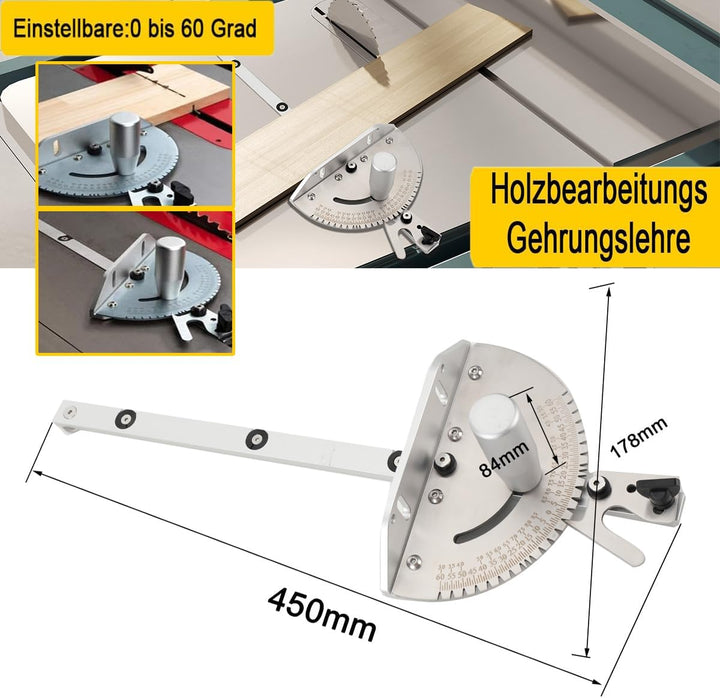 - Spezifikationen : Sie bekommen 1x Gehrungslehre und 1x Einstellbarer Flip Stop. Gehrungslehre Länge: 450mm, Breite:178mm, Schraubengrösse: ca. 6mm (M6), Einstellbare:0 bis 60 Grad. Breite:178mm