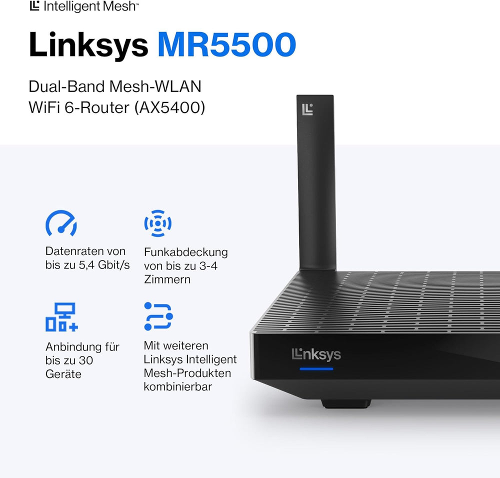 - Exzellente Verbindung: 4K-UHD-Videos lassen sich störungsfrei streamen; Intelligent Mesh-Technologie ermöglicht eine Abdeckung von 250 m² und Datenraten von bis zu 5,4 Gbit/s für mehr als 30 Geräte