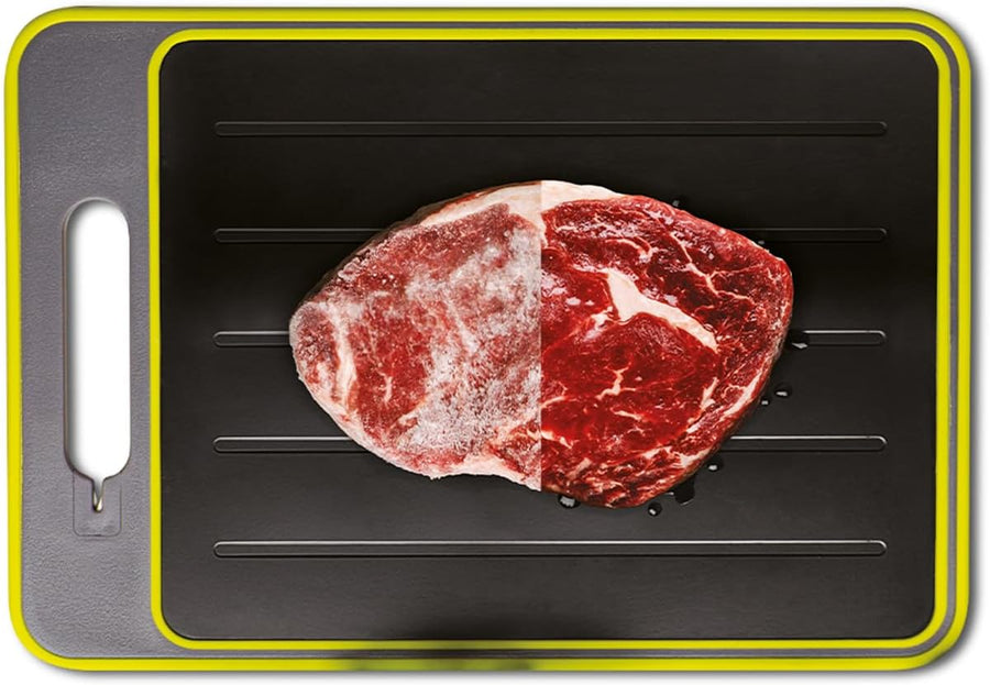 - ✔ SCHNELLER AUFTAUEN – Das Auftau-Küchenbrett (schwarze, gerillte Seite) ist mit einer speziellen Enteisungsoberfläche versehen, sodass gefrorene Lebensmittel bis zu 3x schneller auftauen, ohne Geschmacksverlust!
