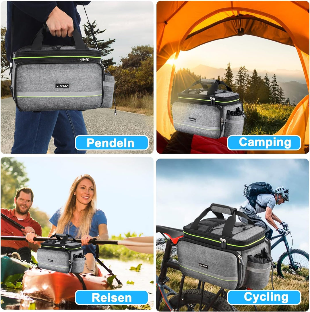 - 【Erweiterbare Kapazität】Die Gepäckträgertaschen ist auf ein Fassungsvermögen von 20-35L erweiterbar. Öffnen Sie die beiden Seitentaschen für mehr Stauraum. Bietet Platz für Lebensmittel, Reparaturwerkzeuge, Pumpen, mobile Stromversorgung usw.