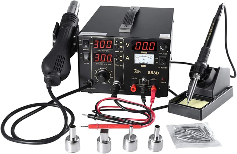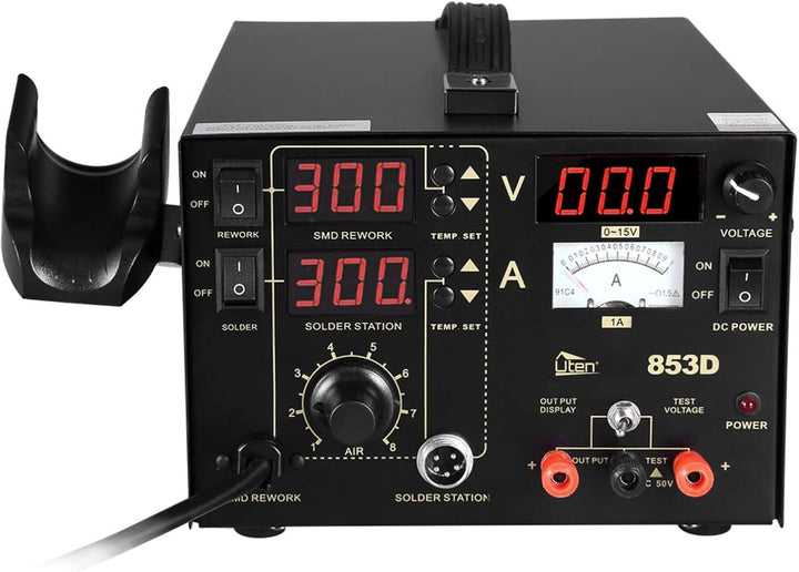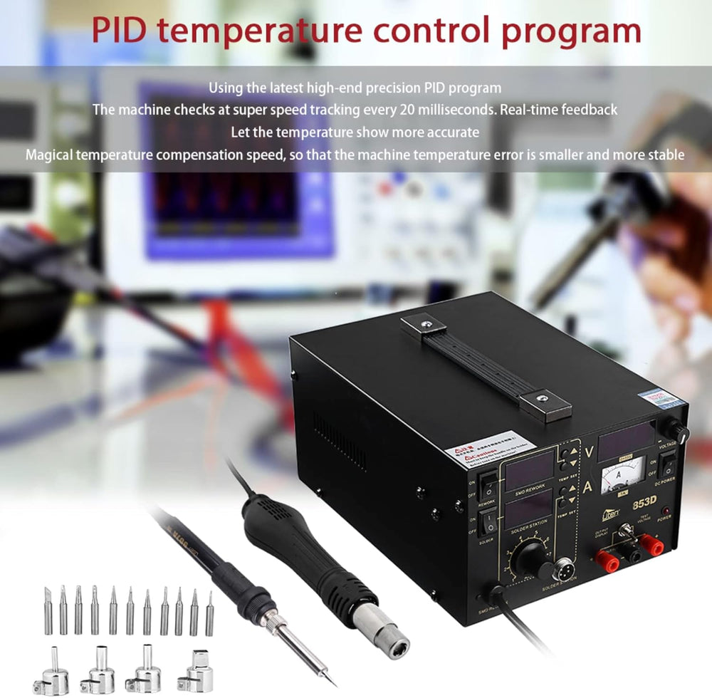- 【LÖTSTATION 3 IN 1 FUNKTIONEN】853D 1A Digital Lötstation intergiert mit bleifreien Löt-Rework-Station 45W, Heissluftpistole 700W und DC-Stromversorgung 1A, ist ideal zum Löten und Entlöten bei der Reparatur an Mobiltelefonen und Elektrogeräten,