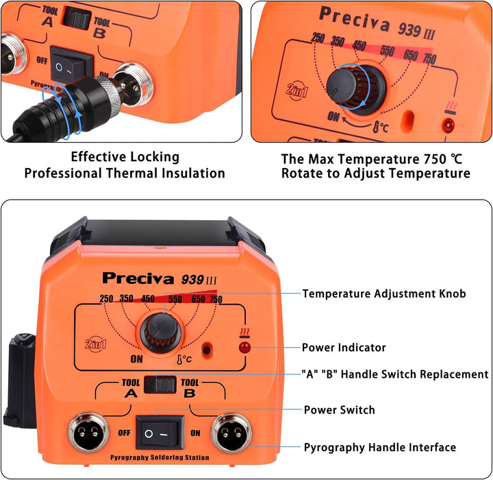 - 【40W Lötstation mit Transformator, schnelles Aufheizen】 Preciva bietet eine Lötstation mit 40W Transformator. Die Brandmalstation kann innerhalb von 10 Sekunden Betriebstemperatur erreichen und sofort in Betrieb genommen werden. Und sorgen für konstante Wärme, um die Verbrennungsarbeit gleichmässig zu erledigen. Die Abkühlgeschwindigkeit des Lötkolbens ist auch schnell nach dem Ausschalten, was den Austausch der Lötspitze vereinfacht.