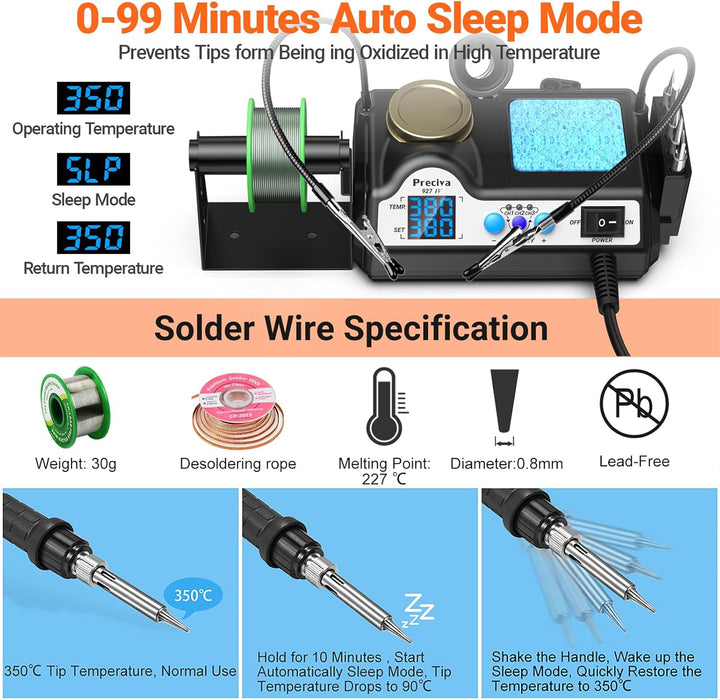 - 【Intelligenter Schlafmodus】-- Sie können die automatische Schlafzeit einstellen (bis zu 99 Minuten). Die Lötstation schaltet automatisch in den Standby-Modus, wenn Sie weiterarbeiten, kehrt die Temperatur schnell auf den zuvor eingestellten Wert