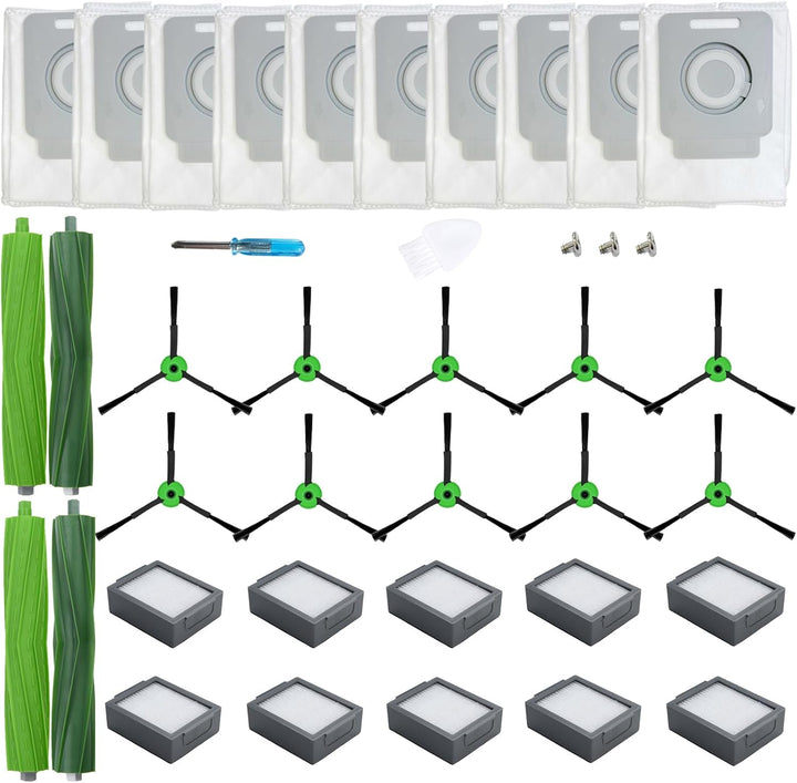 - Wertvolles Paket: Enthält 2 Sätze von Gummibürsten für verschiedene Oberflächen, 10 Roomba-Beutel, 10 Filterpakete, 10 Seitenbürsten, 3 Schrauben, 1 Schraubendreher und 1 Reinigungswerkzeug