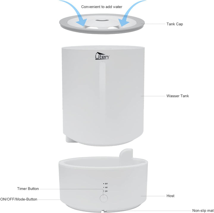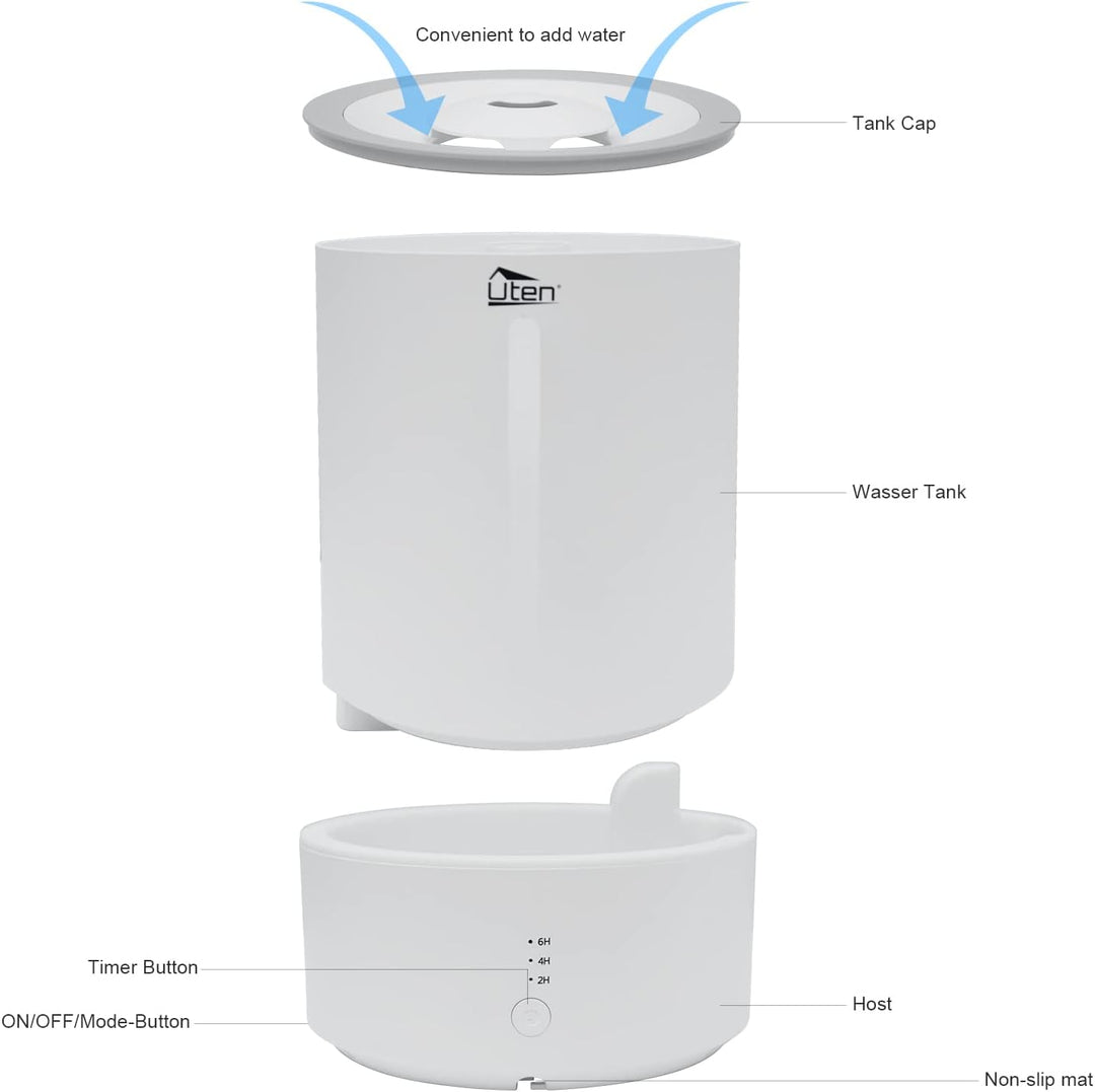 - 🌿【Praktische Timer Funktion】: Humanisiertes Design, 2 bis 12 Stunden zeitgesteuertes Design, Sie müssen sich keine Sorgen machen, dass Sie den Strom nicht ausschalten, wenn Sie ausgehen. Diese Luftbefeuchter hat eine grosse Kapazität von 5