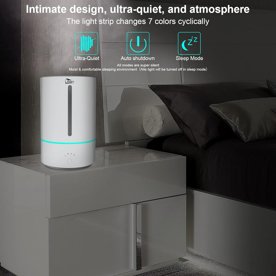 - 🌿【Geeignet für mehrere Räume】: Dieser Luftbefeuchter mit kompake grösse, stilvollem Aussehen , 7 Farben Lichtstreifen ist optimale Wahl für Räume unter 40㎡. Das Ultraschall-Zerstäubungssystem kann jeden Raum(Schlafzimmer, Kinderzimmer,