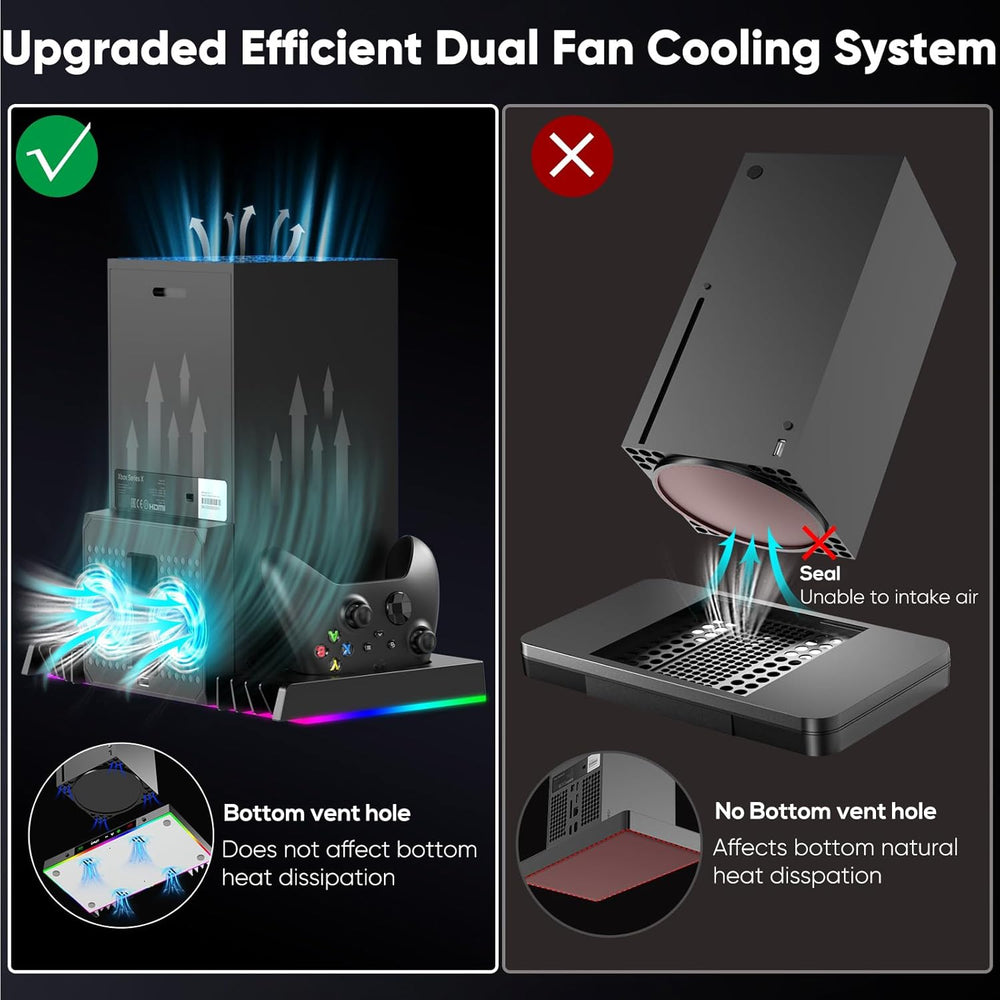 - Leistungsstarkes Kühlsystem: Entsprechend der Struktur der Serie X (die Rückseite erzeugt Wärme und die Oberseite ist der Luftauslass), verwendet der Kühlständer für Xbox Serie X 2 leistungsstarke Kühllüfter, um die kühle Luft anzusaugen und sie