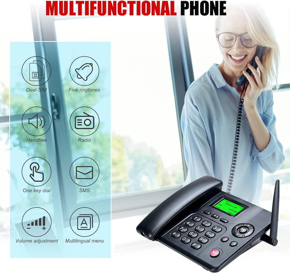 - ☎【Multifunktional】Dieses wireless GSM-Quad-Band-Desktop-Telefon unterstützt mehrsprachige Funktionen, Wahlwiederholung, Pause, Freisprechen, Halten, SMS, Wecker, Kalender und FM-Funkfunktionen. Ideale für Zuhause,Hotel, Büro,Call Center
