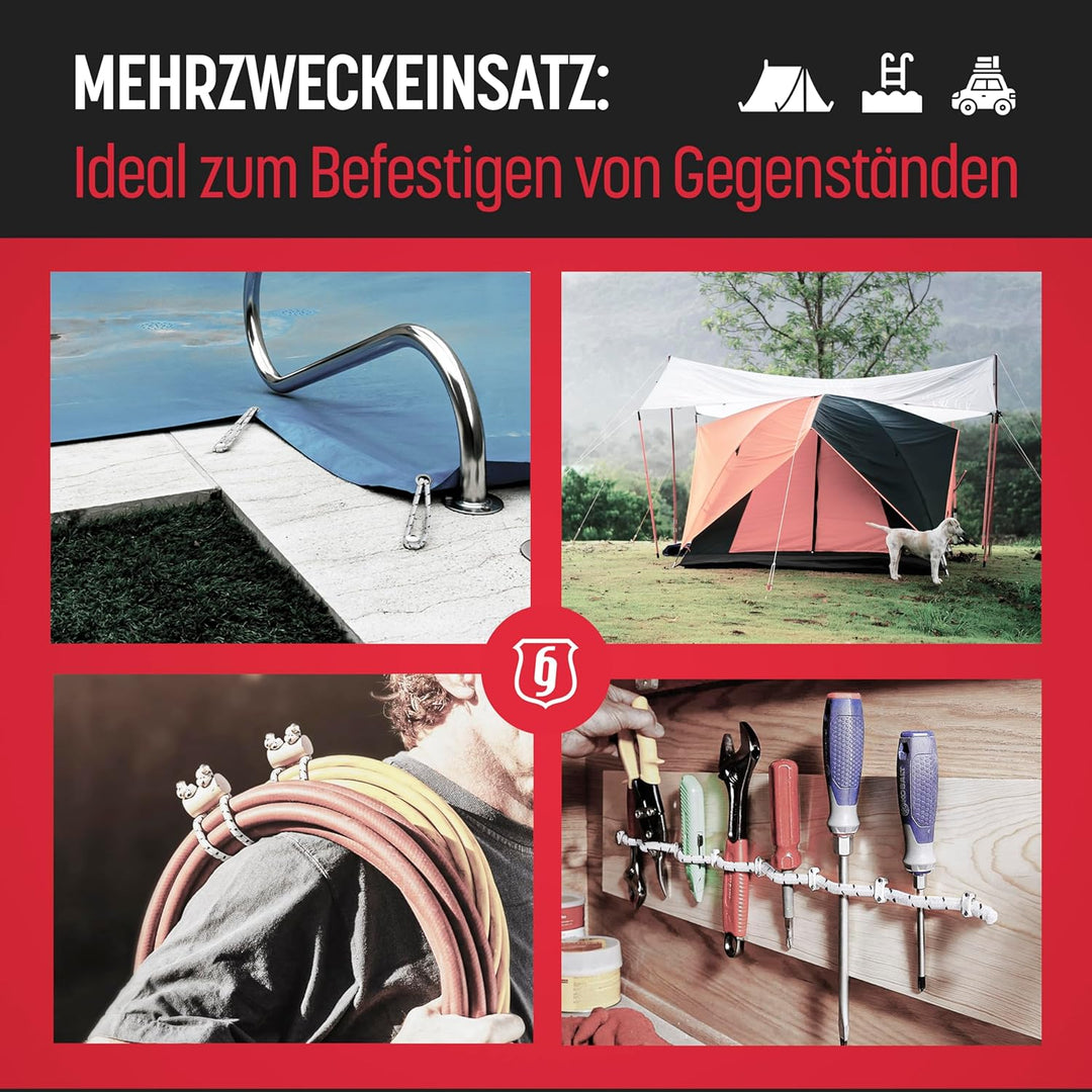 - ⛺ FÜR SCHWERE OBJEKTE - Unser Gummiband hat eine Bruchfestigkeit von 95 kg. Dies bedeutet, dass es das Gewicht von zwei Toiletten, einem durchschnittlichen Mann oder einem halben Fass Bier trägt.