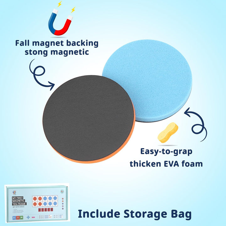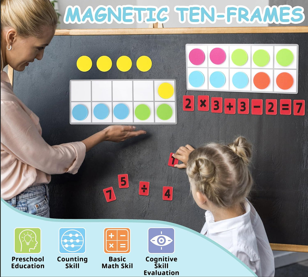 • Magnetisches Zehnerrahmen-Set: Enthält 5 magnetische Antworttafeln und 50 runde Zähler in verschiedenen Farben, 27 Zahlen und Symbole, Themenheft, Stift und eine tragbare Aufbewahrungstasche.