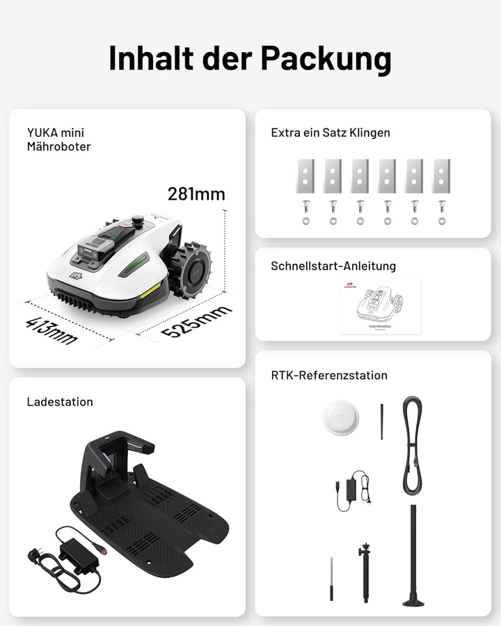 - [Lieferumfang]: 1 x MammotionYUKA mini 500 Mähroboter, 1x Messer-Set, 1 x Installations-Kit für die Ladestation, 1 x RTK-Installations-Kit, 1 x Werkzeugsatz