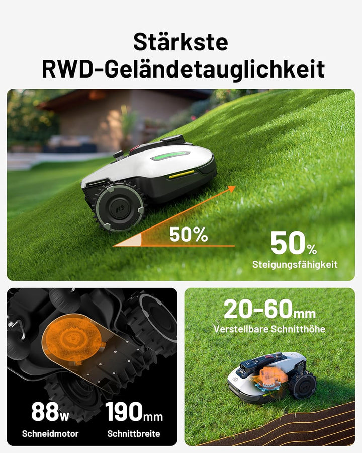 - Hocheffizienter Rasenroboter mit Präzisionsschnitt: Unser leistungsstarker Mammotion Rasenroboter mäht bis zu 150 m² pro Ladung mit seinem 190 mm schwebenden Messer. Einfache Schnitthöhenanpassung(20-60mm) für perfekten Rasen – getestet in