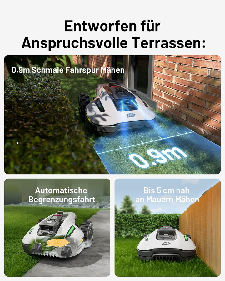 • [Blitzstart in 5 Minuten Ohne Drahtverlegen!]: Rasenmäher Roboter ohne Begrenzungsdraht 96% der Nutzer sind in 5 Minuten mähbereit! Kein manuelles Kartieren: NetRTK&KI-Vision erkennt automatisch Rasenkanten für vollständige Gartenabdeckung.