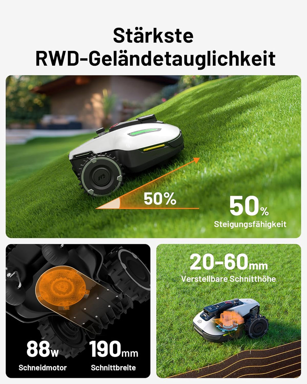 • Hocheffizienter Rasenroboter mit Präzisionsschnitt: Unser leistungsstarker Mammotion Rasenroboter mäht bis zu 150 m² pro Ladung mit seinem 190 mm schwebenden Messer. Einfache Schnitthöhenanpassung(20-60mm) für perfekten Rasen – getestet in