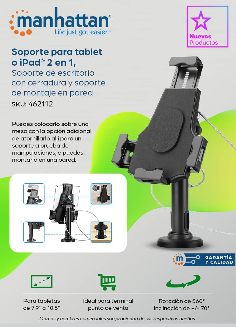 - Verstellbare Halterungen für alle Marken und Grössen von Tablets von 7,9 bis 10,5 Zoll