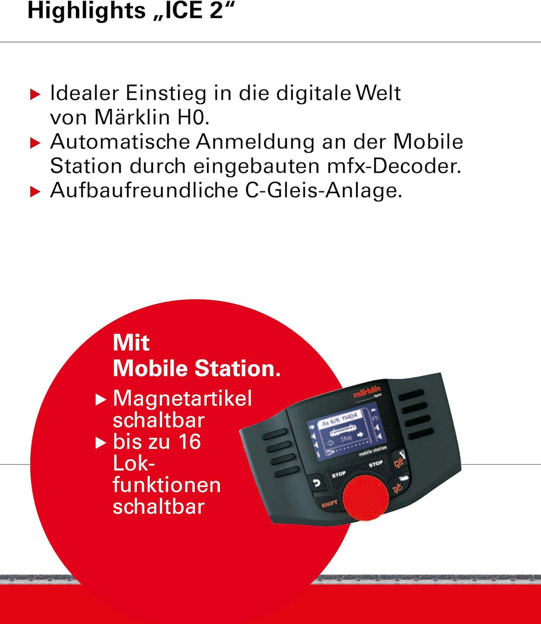 - Inhalt: 14 gebogene Gleise (Art. 24130), 9 gerade Gleise (Art. 24188), 9 gerade Gleise (Art. 24172) und 1 Paar Weichen (Art. 24671) und (Art. 24672) Gleisanschlussbox. Schaltnetzteil 36 VA/230 V. Mobile Station.