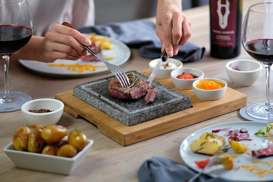 • Dank seiner Schneid- und Kratzfestigkeit kann der Granitstein auch direkt als Fleischteller verwendet werden