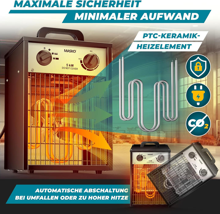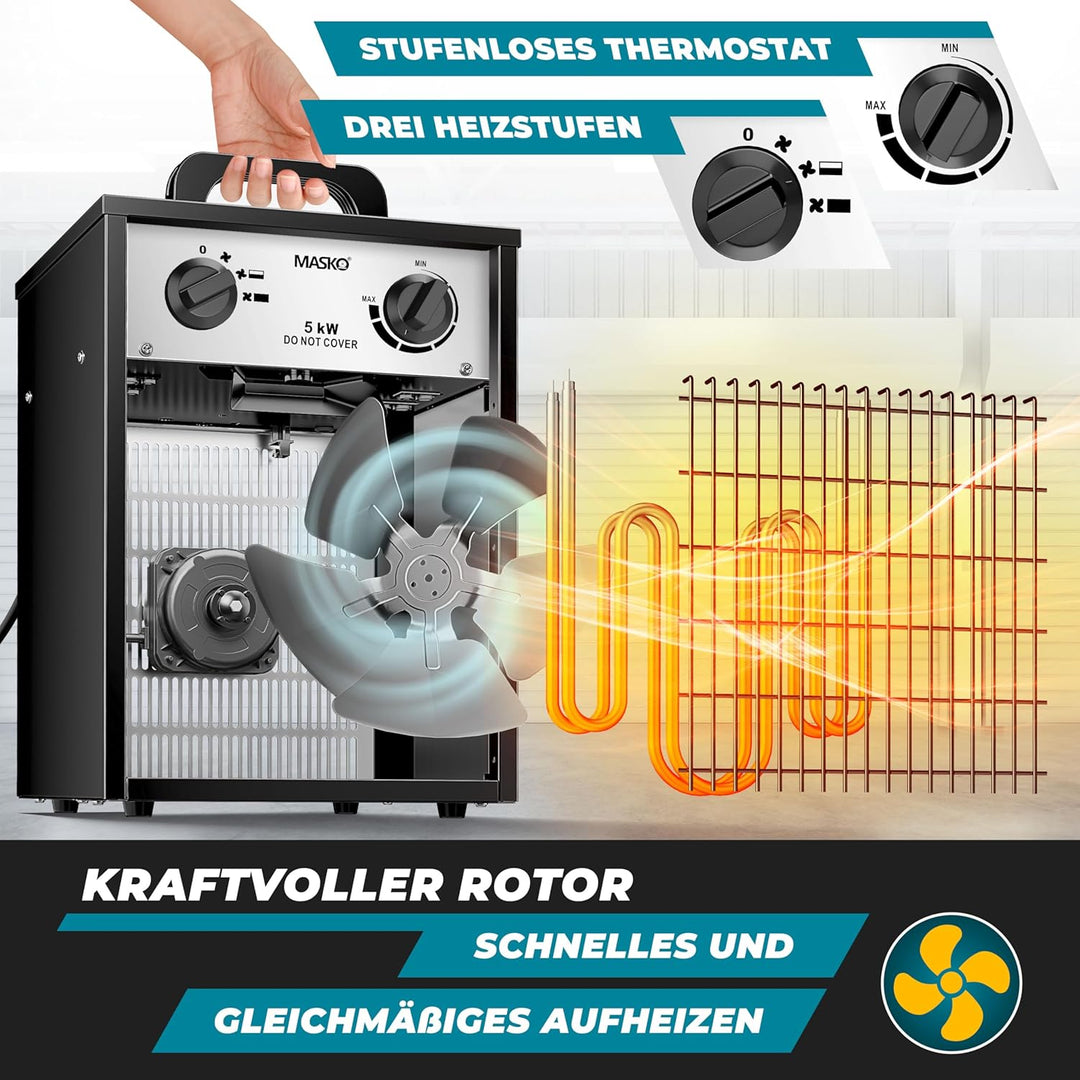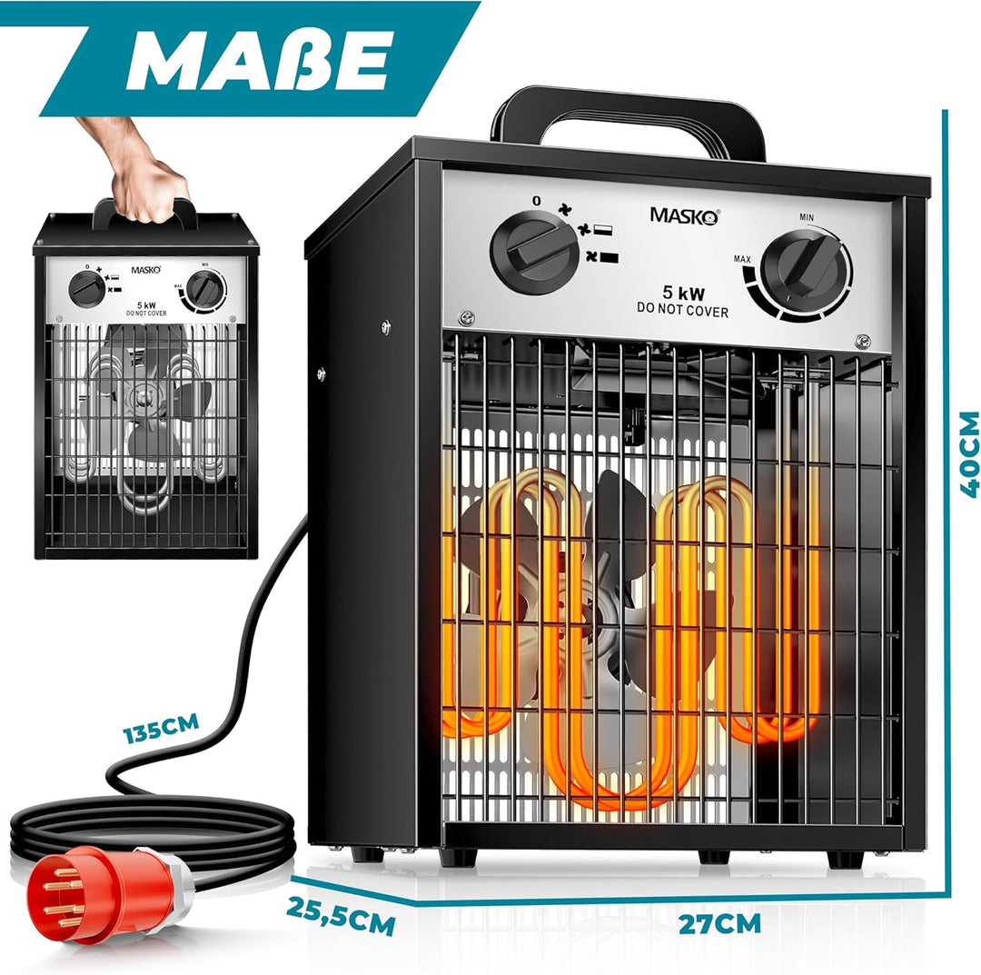 Masko® Elektroheizer Heizlüfter Bauheizer 5 KW mit integriertem Thermostat elektrisch Heizgerät 5000