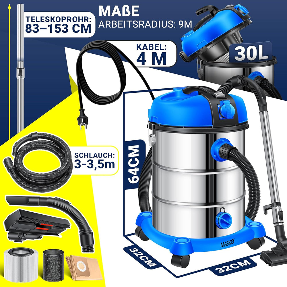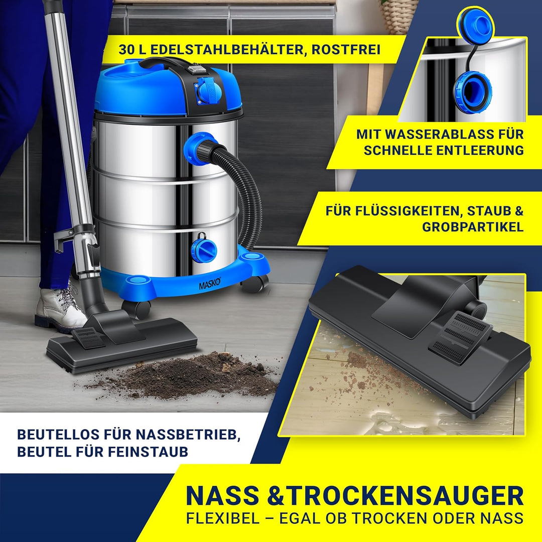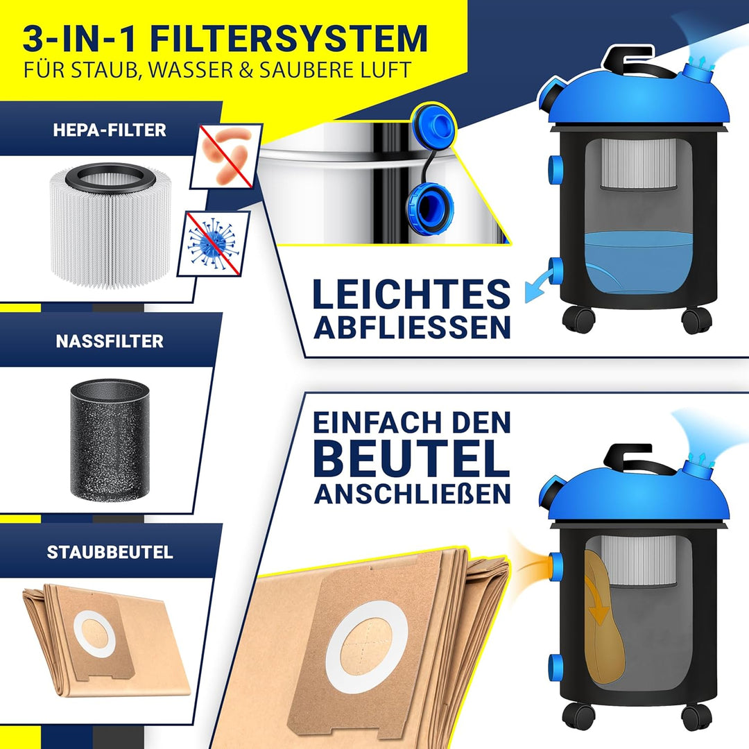 - 𝐄𝐗𝐓𝐑𝐄𝐌 𝐕𝐈𝐄𝐋𝐒𝐄𝐈𝐓𝐈𝐆: Verwendbar als Trockensauger mit Beutel und Filter sowie als beutelloser Wassersauger mit praktischem Wasserablass und 30 Liter Behälter | 3 Wechselfilter = Kartuschenfilter, Feinstaubfilter, Nassfilter