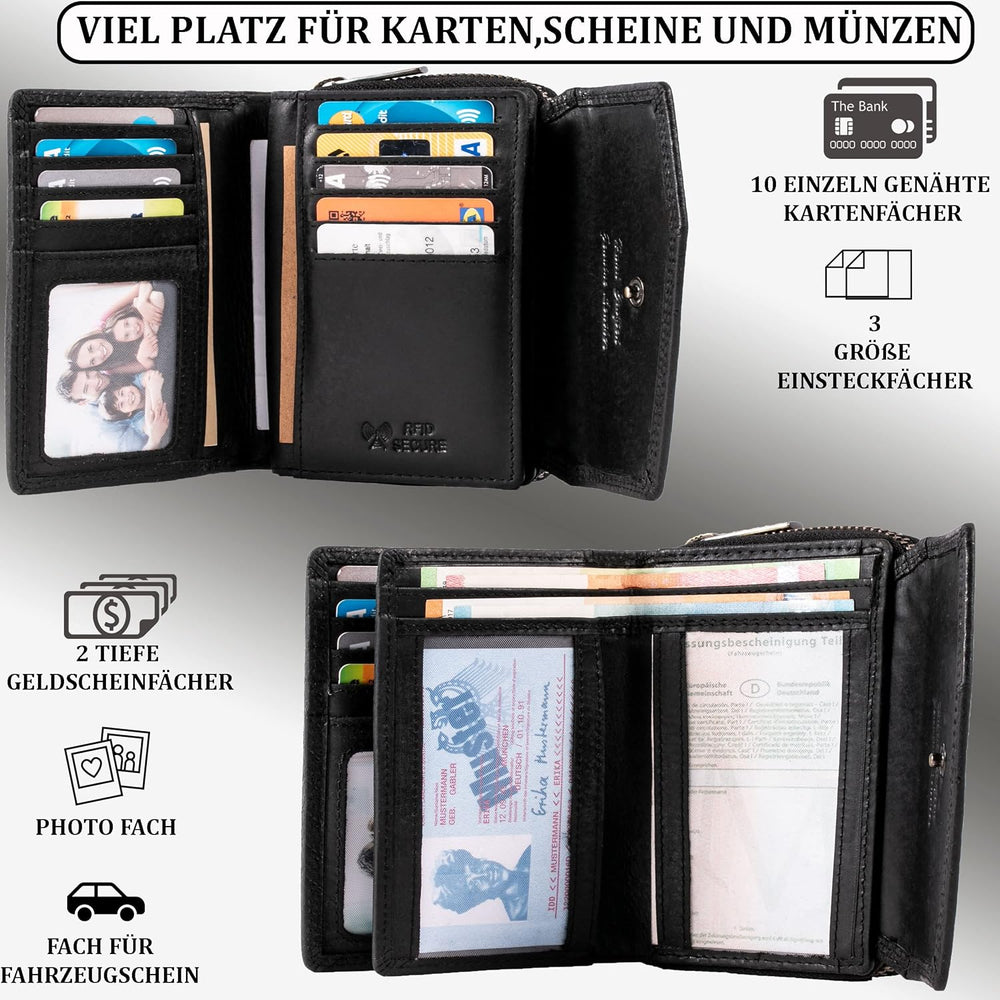 - 10 Kartenfächer jedes einzeln genäht ist - 2 Fächer mit Sichtfenster - 2 Geldscheinfächer - 3 geteilte Kleingeldfächer mit Reissverschluss - 1 verstellbarer Überschlag mit Druckknopfverschluss