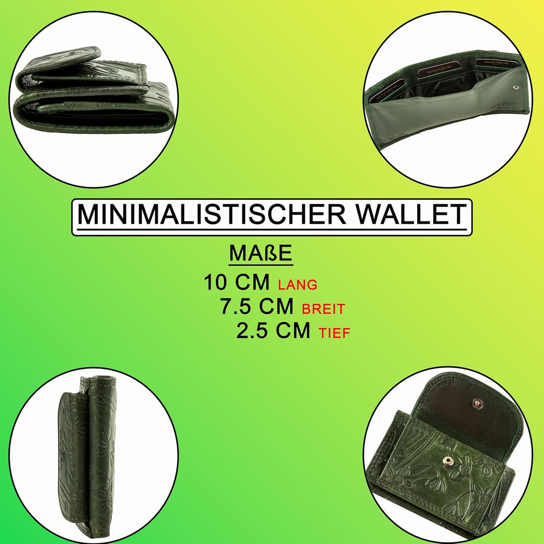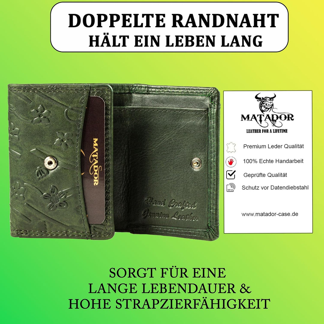 MATADOR Mini Geldtasche Echt Leder Herren Portemonnaie Klein Damen Blumen Muster Grün Klein Geldbörs