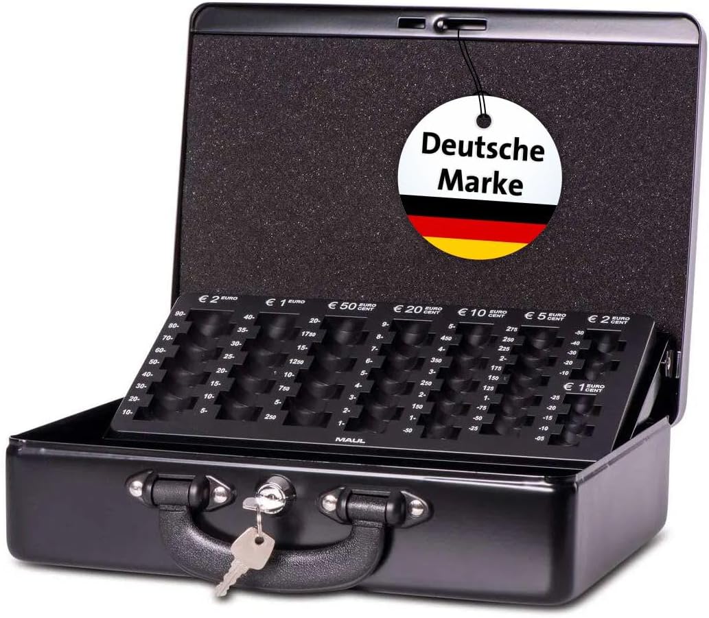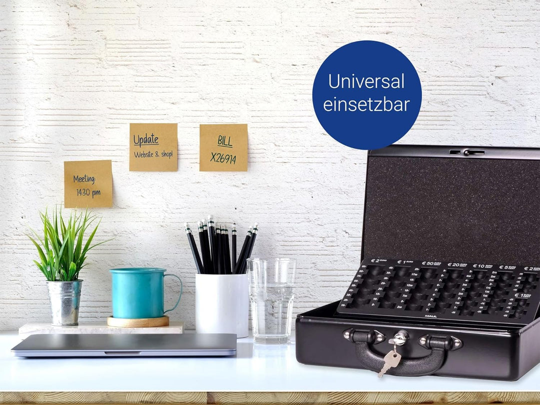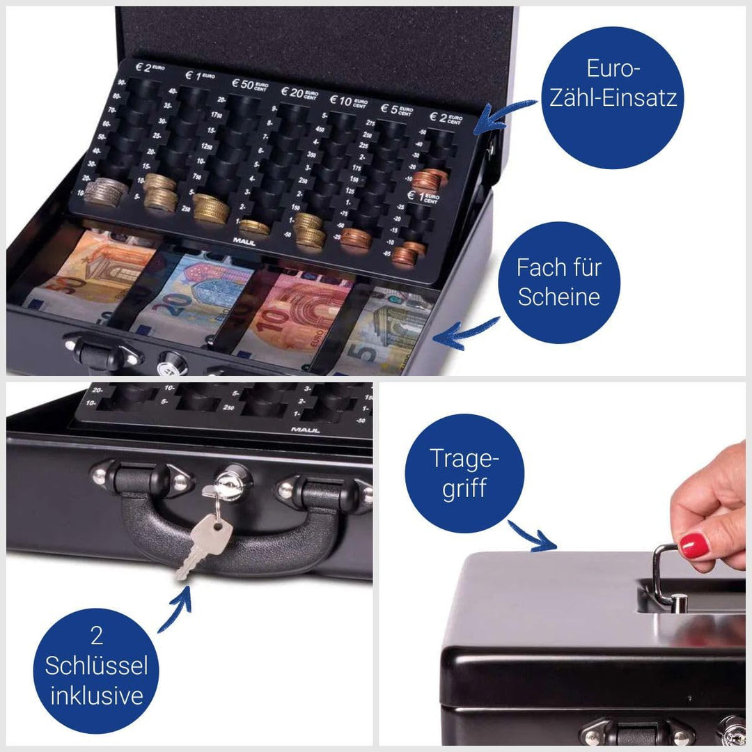 - Die Geldkassette ist aus nahtlos gezogenem, lackiertem Stahl gefertigt und mit einem praktischen Zähleinsatz ausgestattet.
