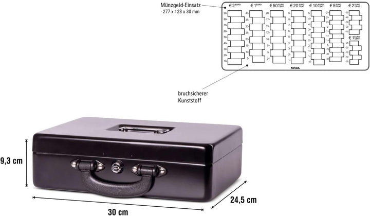 - Masse der Geldkassette: 30 x 24,5 x 9,3 cm.