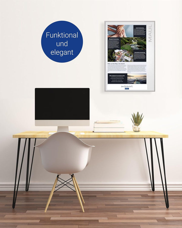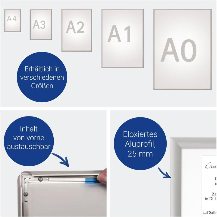 - Flacher Wechselrahmen mit einem 25 mm breiten Klapprahmenprofil aus silbereloxiertem Aluminium.