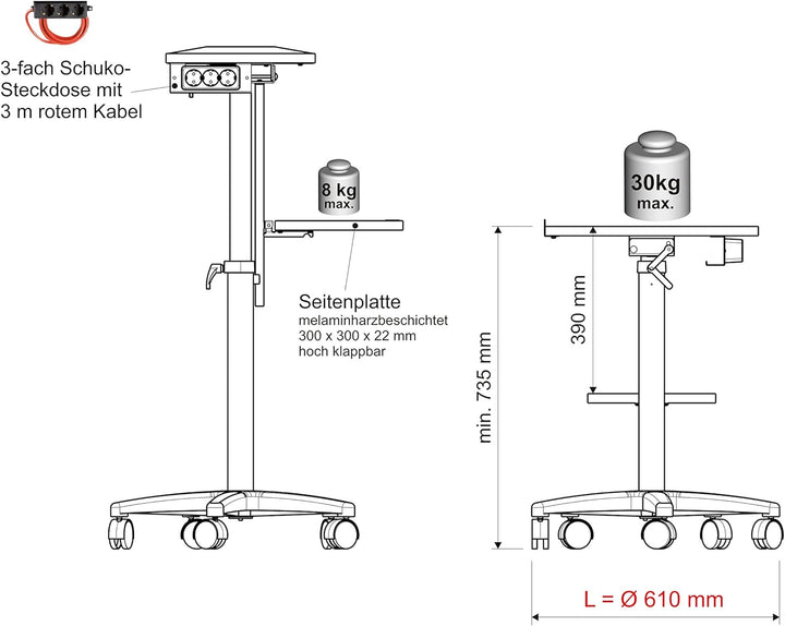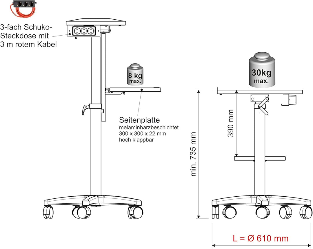 - Inklusiver 3-fach Schuko-Steckdose (GS, VDE) und drei Meter langem rotem Kabel, ein Rednerpult auf Rollen für den perfekten Auftritt.