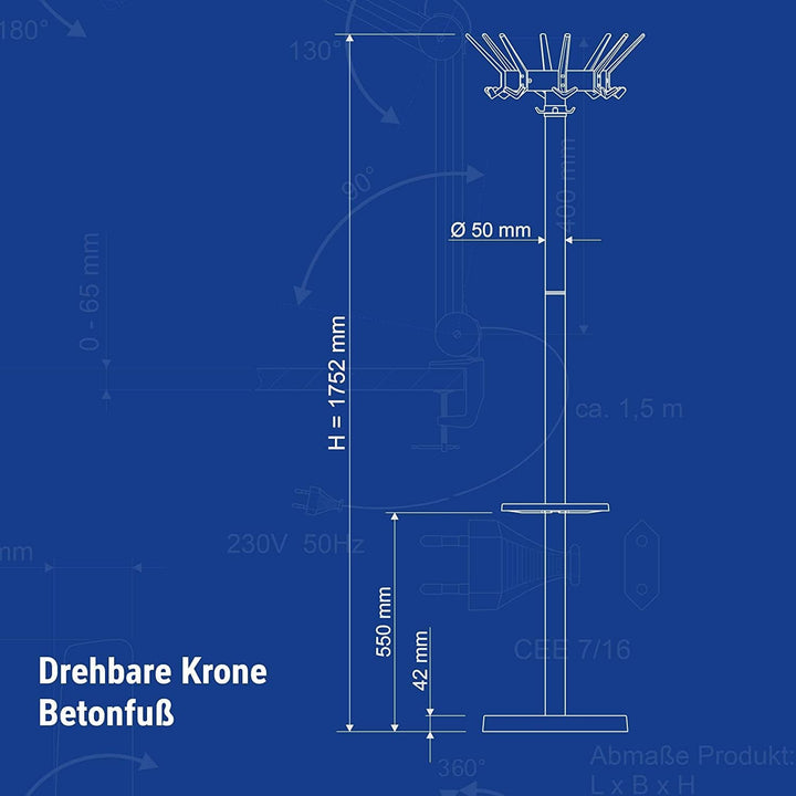 - Kompakt & durchdacht: Durch ihren geringen Durchmesser und die drehbare Krone passt die Garderobe auch in kleine Räume; sie ist ideal für Eingangsbereiche oder Empfangsräume in Büro.