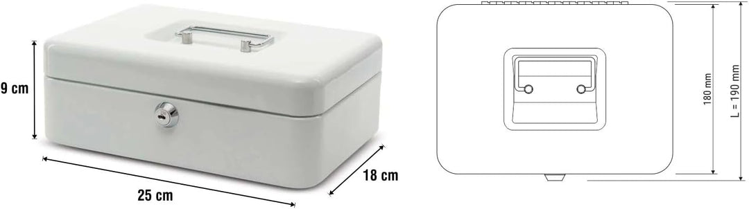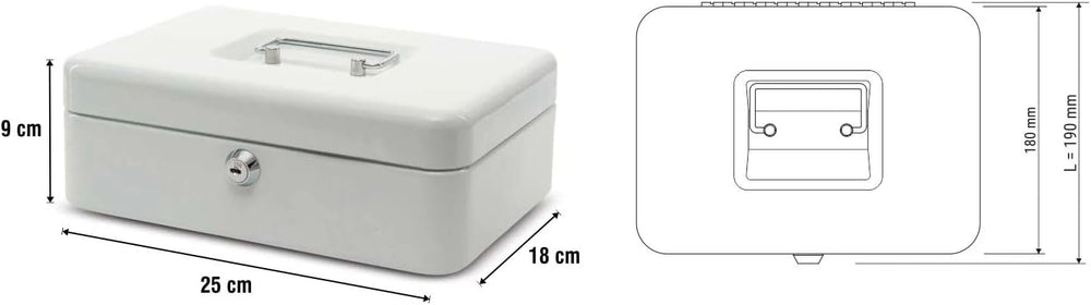 - Masse der MAUL Geldkassette (B x T x H): Das Aussenmass der Cash box beträgt 25 x 18 x 9 cm, das Innenmass der Geldkassette gross liegt bei 24,7 x 16,8 x 6 cm.
