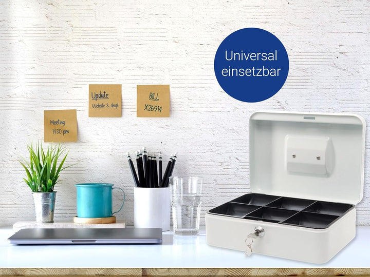 - Clever: Der herausnehmbare Hartgeldeinsatz mit sechs Fächern und das verdeckte Banknotenfach der Geldkassette bieten eine praktische Organisation. Nutzbar auch als Spardose mit Schlüssel und abschliessbare Box.